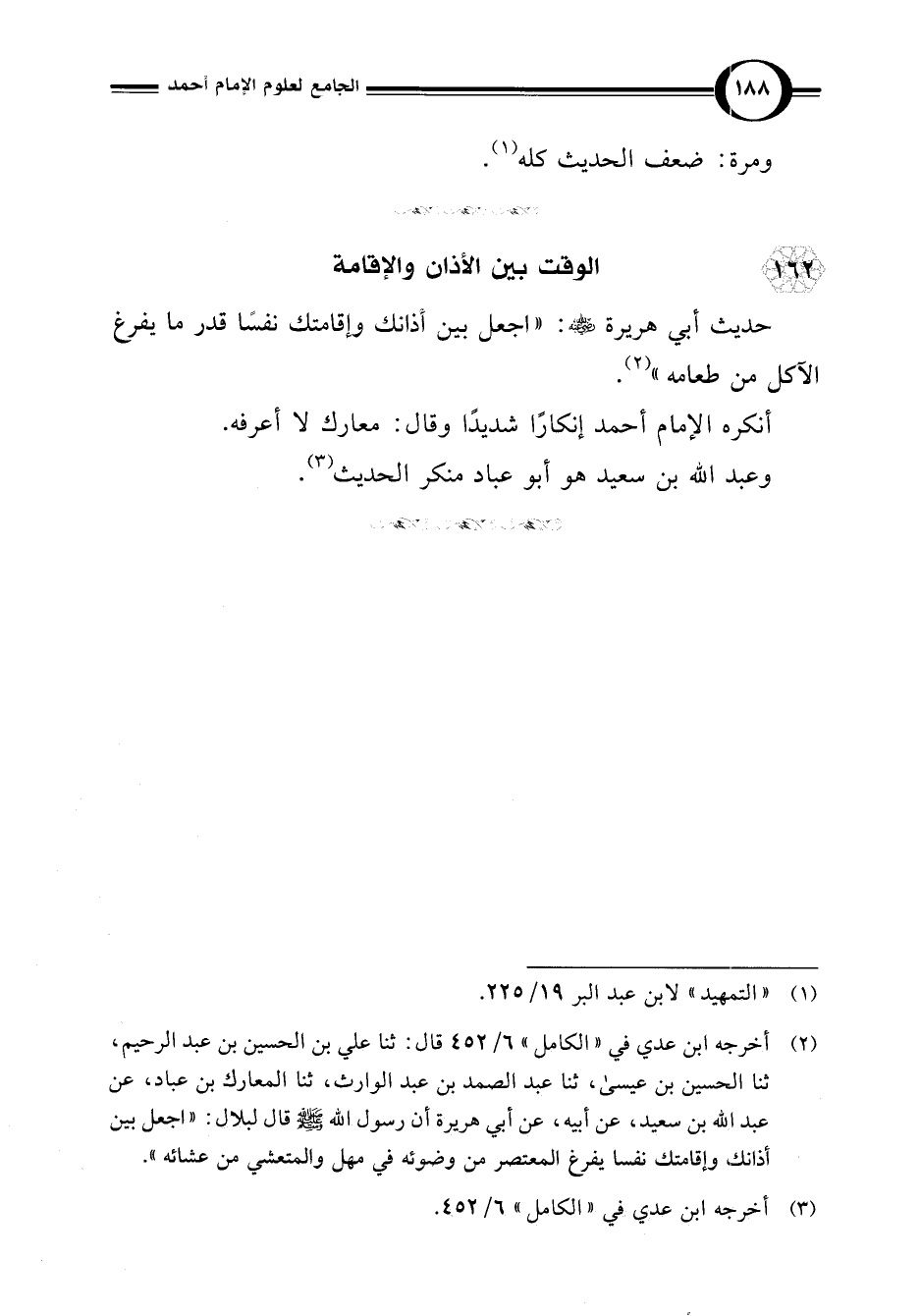 (¬2) أخرجه ابن عدي في "الكامل" 6/ 452 قال: ثنا علي بن الحسين بن عبد الرحيم، ثنا الحسين بن عيسى، ثنا عبد الصمد بن عبد الوارث، ثنا المعارك بن عباد، عن عبد اللَّه بن سعيد، عن أبيه، عن أبي هريرة أن رسول اللَّه -صلى اللَّه عليه وسلم- قال لبلال: "اجعل بين أذانك وإقامتك نفسا يفرغ المعتصر من وضوئه في مهل والمتعشي من عشائه".