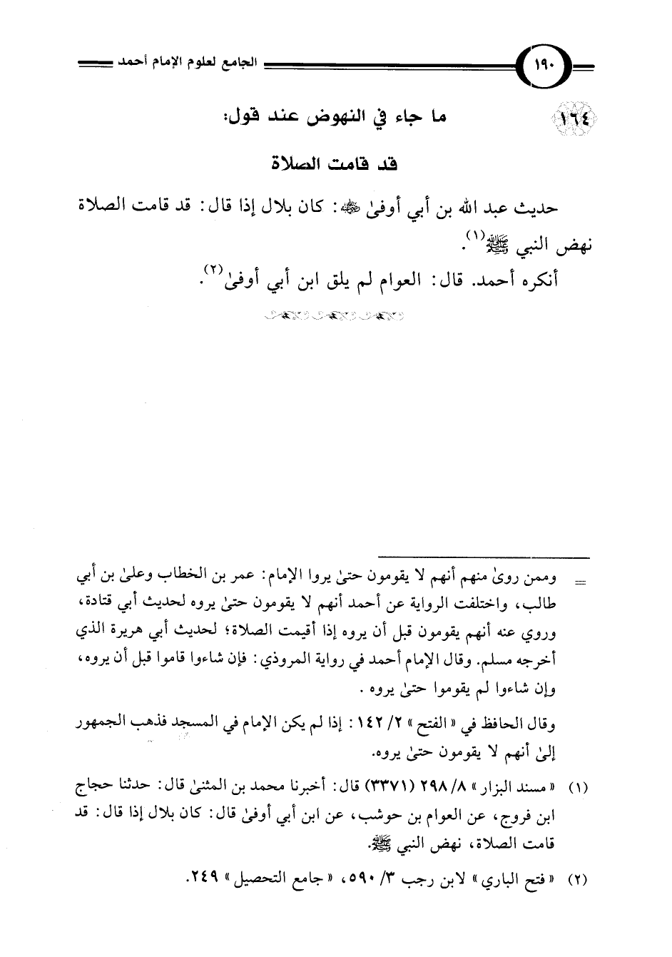 (¬1) "مسند البزار" 8/ 298 (3371) قال: أخبرنا محمد بن المثنى قال: حدثنا حجاج ابن فروج، عن العوام بن حوشب، عن ابن أبي أوفى قال: كان بلال إذا قال: قد قامت الصلاة، نهض النبي -صلى اللَّه عليه وسلم-.