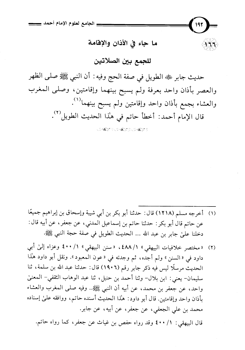 (¬2) "مختصر خلافيات البيهقي" 1/ 488، "سنن البيهقي" 1/ 400 وعزاه إلى أبي داود في "السنن" ولم أجده، ثم وجدته في "عون المعبود". ونقل أبو داود هذا الحديث مرسلًا ليس فيه ذكر جابر رقم (1956) قال: حدثنا عبد اللَّه بن سلمة، ثنا سليمان -يعني: ابن بلال- وثنا أحمد بن حنبل، ثنا عبد الوهاب الثقفي -المعنى واحد، عن جعفر بن محمد، عن أبيه أن النبي -صلى اللَّه عليه وسلم-. . وفيه صلى المغرب والعشاء بأذان واحد وإقامتين. قال أبو داود: هذا الحديث أسنده حاتم، ووافقه على إسناده محمد بن علي الجعفي، عن جعفر، عن أبيه، عن جابر.