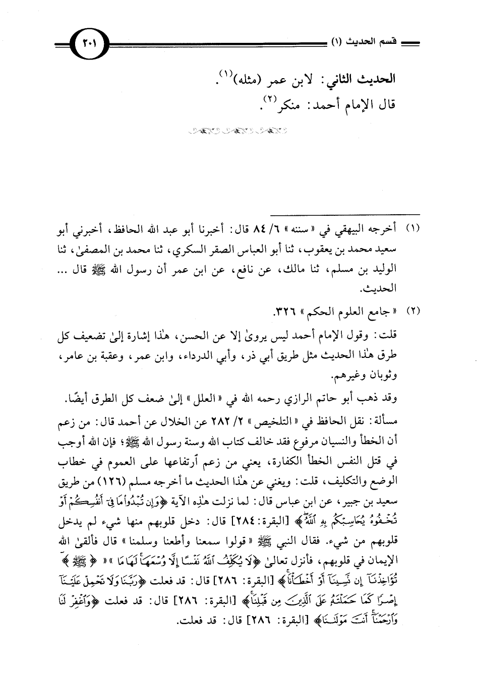 مسألة: نقل الحافظ في "التلخيص" 2/ 282 عن الخلال عن أحمد قال: من زعم أن الخطأ والنسيان مرفوع فقد خالف كتاب اللَّه وسنة رسول اللَّه -صلى اللَّه عليه وسلم- فإن اللَّه أوجب في قتل النفس الخطأ الكفارة، يعني من زعم ارتفاعها على العموم في خطاب الوضع والتكليف، قلت: ويغني عن هذا الحديث ما أخرجه مسلم (126) من طريق سعيد بن جبير، عن ابن عباس قال: لما نزلت هذِه الآية {وَإِنْ تُبْدُوا مَا فِي أَنْفُسِكُمْ أَوْ تُخْفُوهُ يُحَاسِبْكُمْ بِهِ اللَّهُ} [البقرة: 284] قال: دخل قلوبهم منها شيء لم يدخل قلوبهم من شيء. فقال النبي -صلى اللَّه عليه وسلم- "قولوا سمعنا وأطعنا وسلمنا" قال فألقى اللَّه الإيمان في قلوبهم، فأنزل تعالى {لَا يُكَلِّفُ اللَّهُ نَفْسًا إِلَّا وُسْعَهَا لَهَا مَا كَسَبَتْ وَعَلَيْهَا مَا اكْتَسَبَتْ رَبَّنَا لَا تُؤَاخِذْنَا إِنْ نَسِينَا أَوْ أَخْطَأْنَا} [البقرة: 286] قال: قد فعلت {رَبَّنَا وَلَا تَحْمِلْ عَلَيْنَا إِصْرًا كَمَا حَمَلْتَهُ عَلَى الَّذِينَ مِنْ قَبْلِنَا رَبَّنَا} [البقرة: 286] قال: قد فعلت {وَاغْفِرْ لَنَا وَارْحَمْنَا أَنْتَ مَوْلَانَا} [البقرة: 286] قال: قد فعلت.