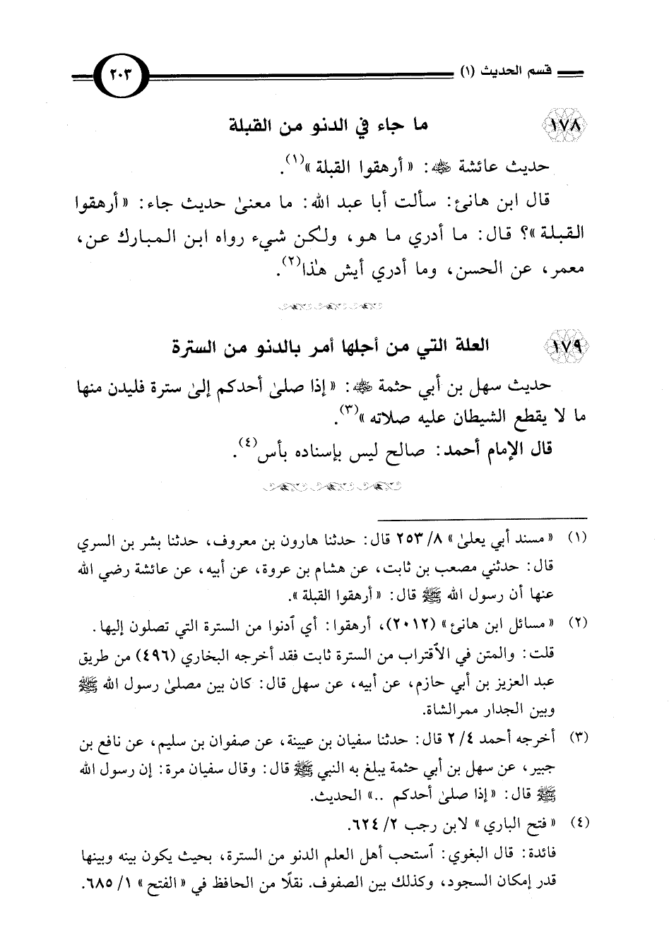 (¬2) "مسائل ابن هانئ" (2012)، أرهقوا: أي ادنوا من السترة التي تصلون إليها.