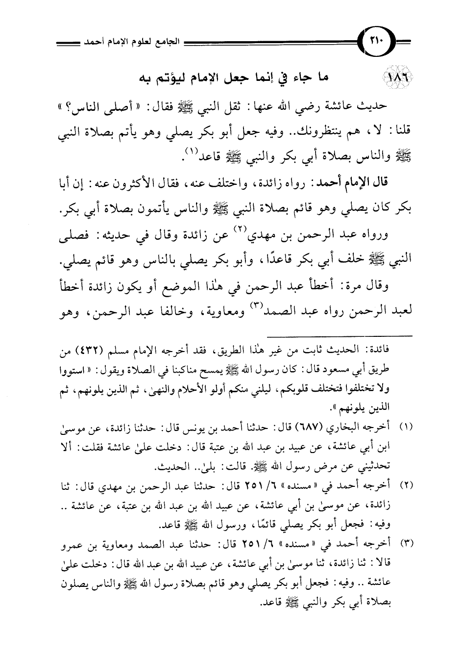 قال الإمام أحمد: رواه زائدة، وا ختلف عنه، فقال الأكثرون عنه: إن أبا بكر كان يصلي وهو قائم بصلاة النبي -صلى اللَّه عليه وسلم- والناس يأتمون بصلاة أبي بكر.