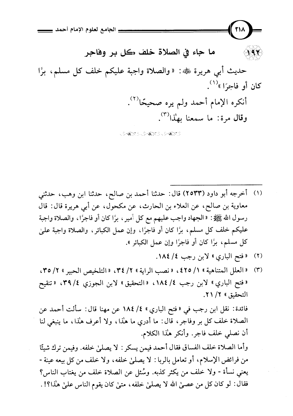 (¬1) أخرجه أبو داود (2533) قال: حدثنا أحمد بن صالح، حدثنا ابن وهب، حدثني معاوية بن صالح، عن العلاء بن الحارث، عن مكحول، عن أبي هريرة قال: قال رسول اللَّه -صلى اللَّه عليه وسلم-: "الجهاد واجب عليهم مع كل أمير، برًا كان أو فاجرًّا، والصلاة واجبة عليكم خلف كل مسلم، برًّا كان أو فاجرًّا، وإن عمل الكبائر، والصلاة واجبة على كل مسلم، برًا كان أو فاجرًّا وإن عمل الكبائر".