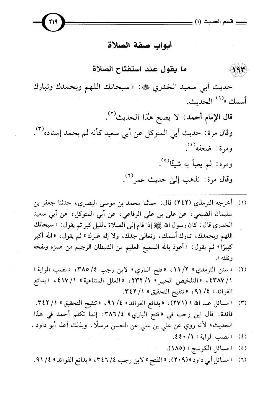 (¬1) أخرجه الترمذي (242) قال: حدثنا محمد بن موسى البصري، حدثنا جعفر بن سليمان الضبعي، عن علي بن علي الرفاعي، عن أبي المتوكل، عن أبي سعيد الخدري قال: كان رسول اللَّه -صلى اللَّه عليه وسلم- إذا قام إلى الصلاة بالليل كبر ثم يقول: "سبحانك اللهم وبحمدك، تبارك اسمك، وتعالى جدك، ولا إله غيرك" ثم يقول، "اللَّه أكبر كبيرًا" ثم يقول: "أعوذ باللَّه السميع العليم من الشيطان الرجيم من همزه ونفخه ونفثه".