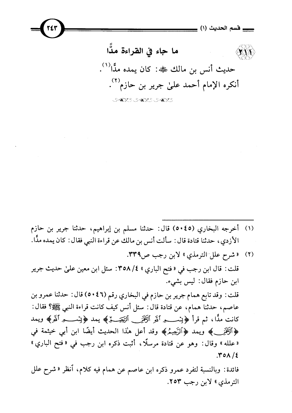 (¬1) أخرجه البخاري (5045) قال: حدثنا مسلم بن إبراهيم، حدثنا جرير بن حازم الأزدي، حدثنا قتادة قال: سألت أنس بن مالك عن قراءة النبي فقال: كان يمده مدًّا.