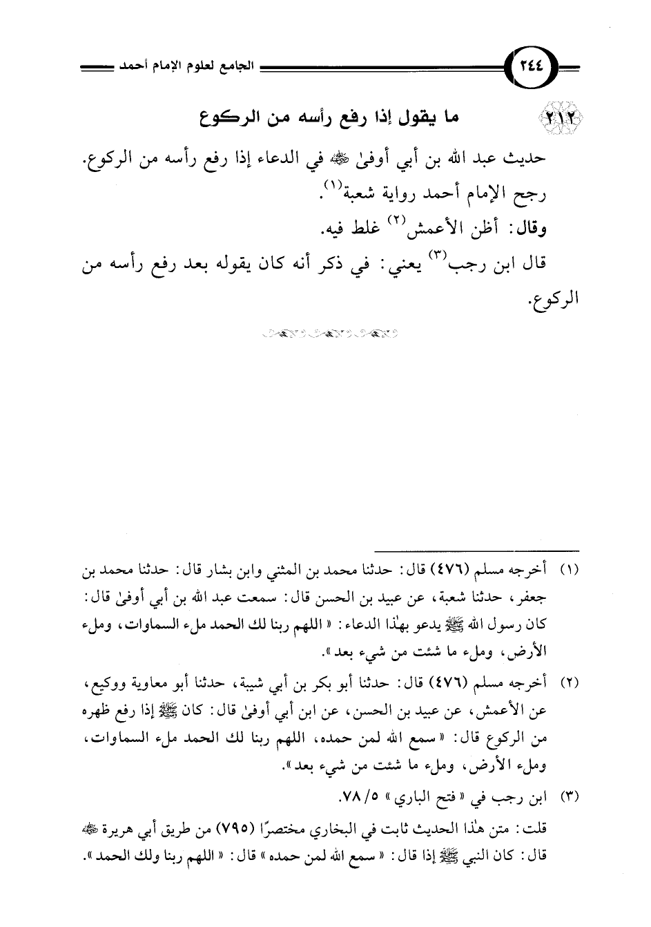 (¬2) أخرجه مسلم (476) قال: حدثنا أبو بكر بن أبي شيبة، حدثنا أبو معاوية ووكيع، عن الأعمش، عن عبيد بن الحسن، عن ابن أبي أوفى قال: كان -صلى اللَّه عليه وسلم- إذا رفع ظهره من الركوع قال: "سمع اللَّه لمن حمده، اللهم ربنا لك الحمد ملء السماوات، وملء الأرض، وملء ما شئت من شيء بعد".