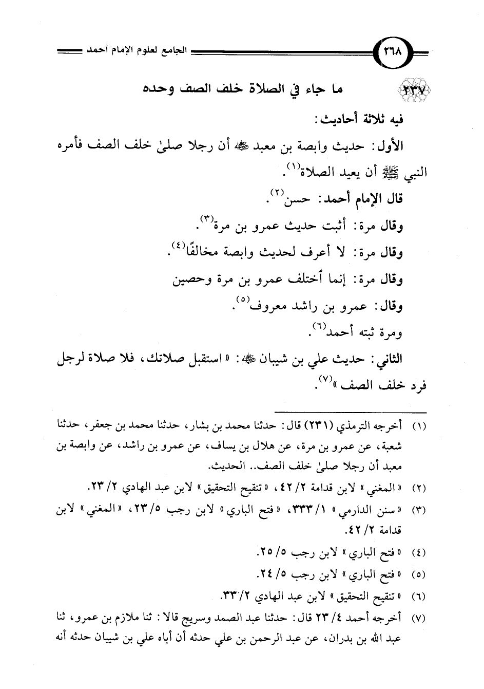 (¬1) أخرجه الترمذي (231) قال: حدثنا محمد بن بشار، حدثنا محمد بن جعفر، حدثنا شعبة، عن عمرو بن مرة، عن هلال بن يساف، عن عمرو بن راشد، عن وابصة بن معبد أن رجلا صلى خلف الصف. . الحديث.