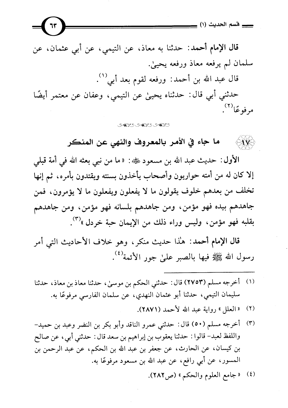 (¬3) أخرجه مسلم (50) قال: حدثني عمرو الناقد وأبو بكر بن النضر وعبد بن حميد -واللفظ لعبد- قالوا: حدثنا يعقوب بن إبراهيم بن سعد قال: حدثني أبي، عن صالح بن كيسان، عن الحارث، عن جعفر بن عبد اللَّه بن الحكم، عن عبد الرحمن بن المسور، عن أبي رافع، عن عبد اللَّه بن مسعود مرفوعًا به.