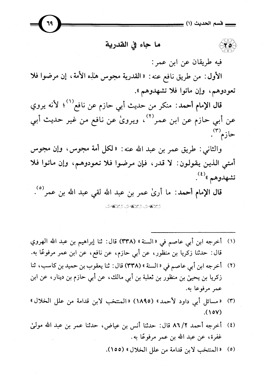 والثاني: طريق عمر بن عبد اللَّه عنه: "لكل أمة مجوس، وإن مجوس أمتي الذين يقولون: لا قدر، فإن مرضوا فلا تعودوهم، وإن ماتوا فلا تشهدوهم" (¬4).