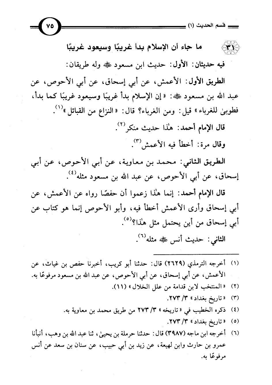 الطريق الأول: الأعمش، عن أبي إسحاق، عن أبي الأحوص، عن عبد اللَّه بن مسعود -رضي اللَّه عنه-: "إن الإسلام بدأ غريبًا وسيعود غريبًا كما بدأ، فطوبى للغرباء" قيل: ومن الغرباء؟ قال: "النزاع من القبائل" (¬1).
