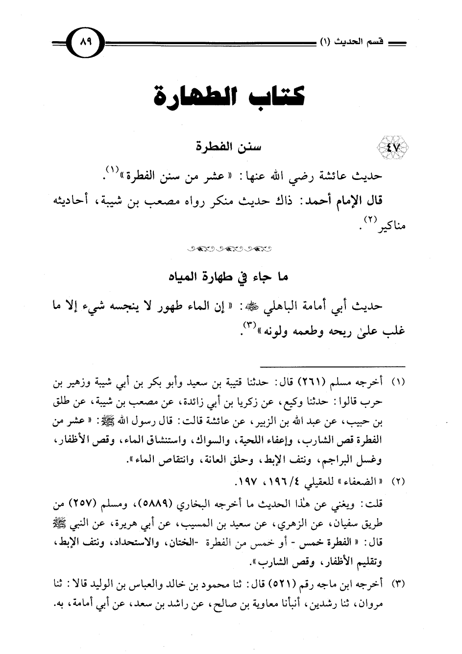 حديث أبي أمامة الباهلي -رضي اللَّه عنه-: "إن الماء طهور لا ينجسه شيء إلا ما غلب على ريحه وطعمه ولونه" (¬3).
