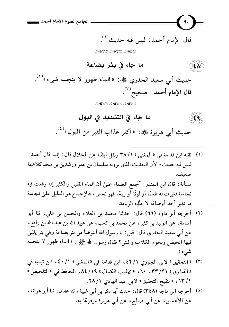 (¬3) "التحقيق" لابن الجوزي 1/ 42، ابن قدامة في "المغني" 1/ 40، ابن تيمية في "الفتاوى" 21/ 33، 60، "تهذيب الكمال" 19/ 84، الحافظ في "التلخيص" 1/ 13، "تنقيح التحقيق" لابن عبد الهادي 1/ 28.