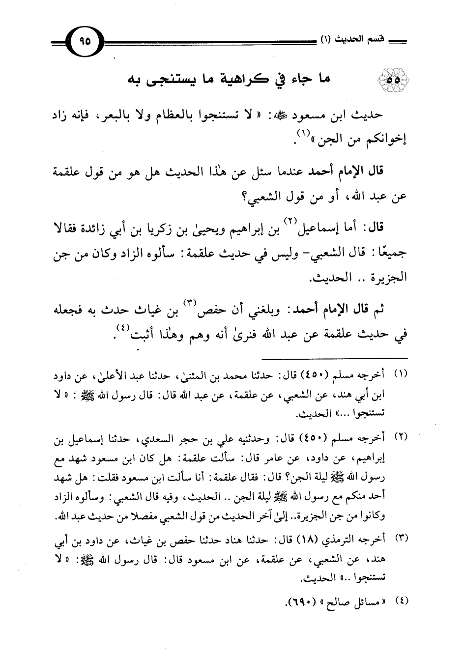 (¬1) أخرجه مسلم (450) قال: حدثنا محمد بن المثنى، حدثنا عبد الأعلى، عن داود ابن أبي هند، عن الشعبي، عن علقمة، عن عبد اللَّه قال: قال رسول اللَّه -صلى اللَّه عليه وسلم-: "لا تستنجوا. . . " الحديث.