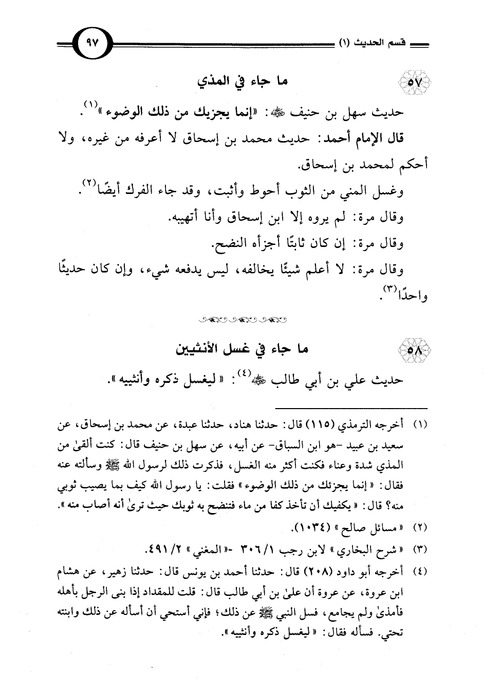 (¬4) أخرجه أبو داود (208) قال: حدثنا أحمد بن يونس قال: حدثنا زهير، عن هشام ابن عروة، عن عروة أن علي بن أبي طالب قال: قلت للمقداد إذا بنى الرجل بأهله فأمذى ولم يجامع، فسل النبي -صلى اللَّه عليه وسلم- عن ذلك؛ فإني أستحي أن أسأله عن ذلك وابنته تحتي. فسأله فقال: "ليغسل ذكره وأنثييه".