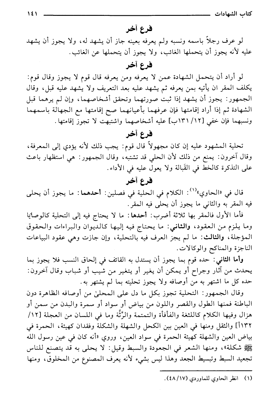 تحلية المشهود عليه إن كان مجهولاً قال قوم: يجب ذلك لأنه يؤدي إلى المعرفة، وقال آخرون: يمنع من ذلك لأن الحلي قد تشتبه، وقال الجمهور: هي استظهار باعث على التذكرة كالخط في القبالة ولا يعول عليه في الأداء.