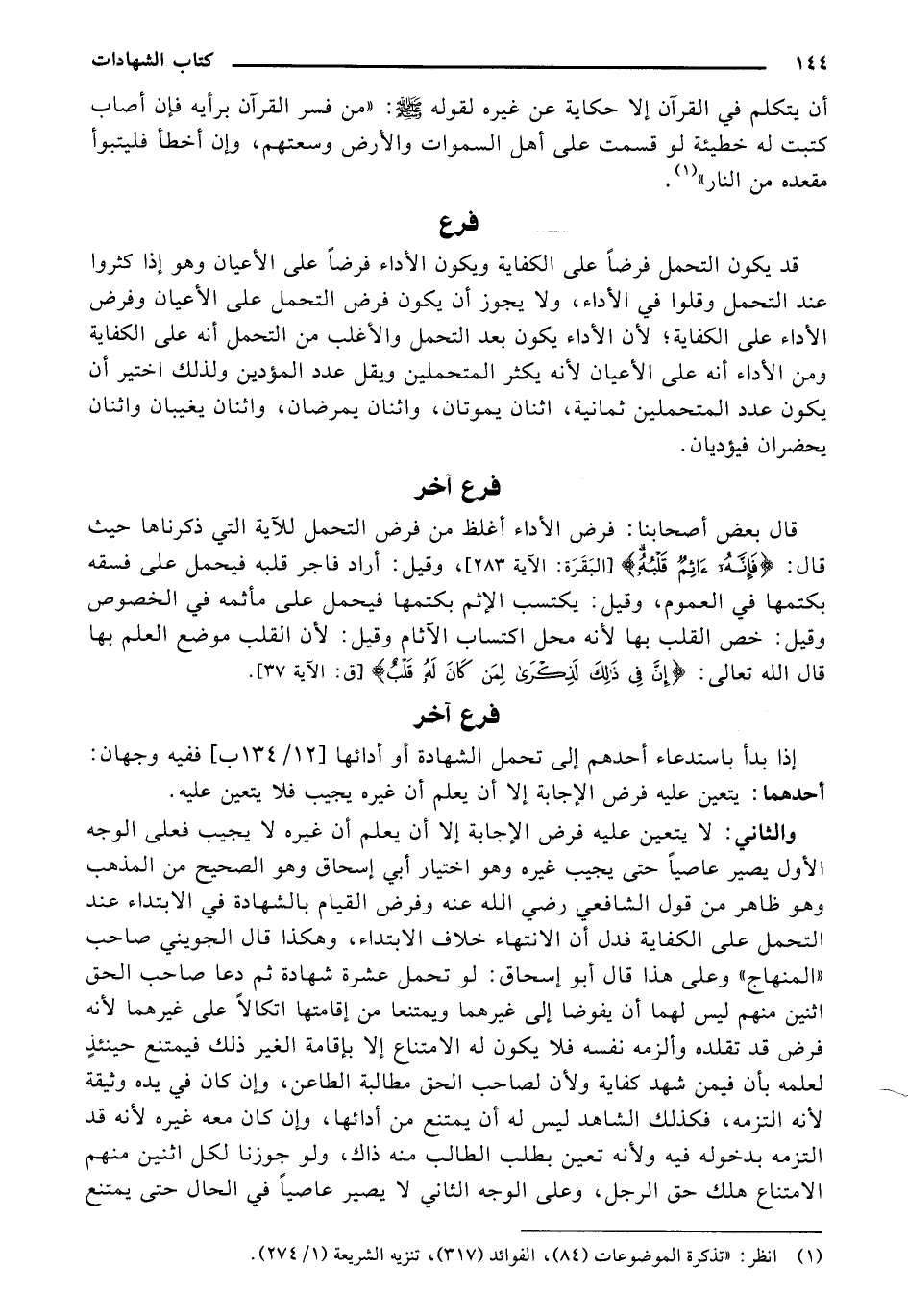 قد يكون التحمل فرضاً على الكفاية ويكون الأداء فرضاً على الأعيان وهو إذا كثروا عند التحمل وقلوا في الأداء، ولا يجوز أن يكون فرض التحمل على الأعيان وفرض الأداء على الكفاية؛ لأن الأداء يكون بعد التحمل والأغلب من التحمل أنه على الكفاية ومن الأداء أنه على الأعيان لأنه يكثر المتحملين ويقل عدد المؤدين ولذلك اختير أن يكون عدد المتحملين ثمانية، اثنان يموتان، واثنان يمرضان، واثنان يغيبان واثنان يحضران فيؤديان.