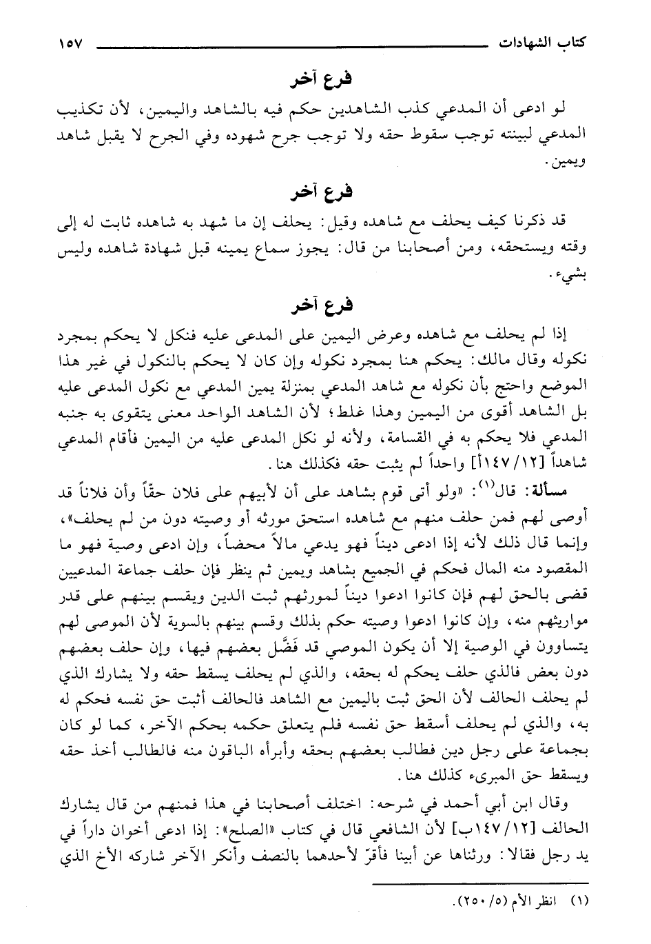 مسألة: قال: "ولو أتى قوم بشاهد على أن لأبيهم على فلان حقًا وأن فلانًا قد أوصى لهم فمن حلف منهم مع شاهده استحق مورثه أو وصيته دون من لم يحلف"، وإنما قال ذلك لأنه إذا ادعى دينًا فهو يدعي مالًا محضًا، وإن ادعى وصية فهو ما المقصود منه المال فحكم في الجميع بشاهد ويمين ثم ينظر فإن حلف جماعة المدعيين قضى بالحق لهم فإن كانوا ادعوا دينًا لمورثهم ثبت الدين ويقسم بينهم على قدر مواريثهم منه، وإن كانوا ادعوا وصيته حكم بذلك وقسم بينهم بالسوية لأن الموصى لهم يتساوون في الوصية إلا أن يكون الموصى قد فضل بعضهم فيها، وإن حلف بعضهم دون بعض فالذي حلف يحكم له بحقه، والذي لم يحلف يسقط حقه ولا يشارك الذي لم يحلف الحالف لأن الحق ثبت باليمين مع الشاهد فالحالف أثبت حق نفسه فحكم له به، والذي لم يحلف أسقط حق نفسه فلم يتعلق حكمه بحكم الآخر، كما لو كان بجماعة على رجل دين فطالب بعضهم بحقه وأبرأه الباقون منه فالطالب أخذ بحقه ويسقط حق المبرئ كذلك هنا.