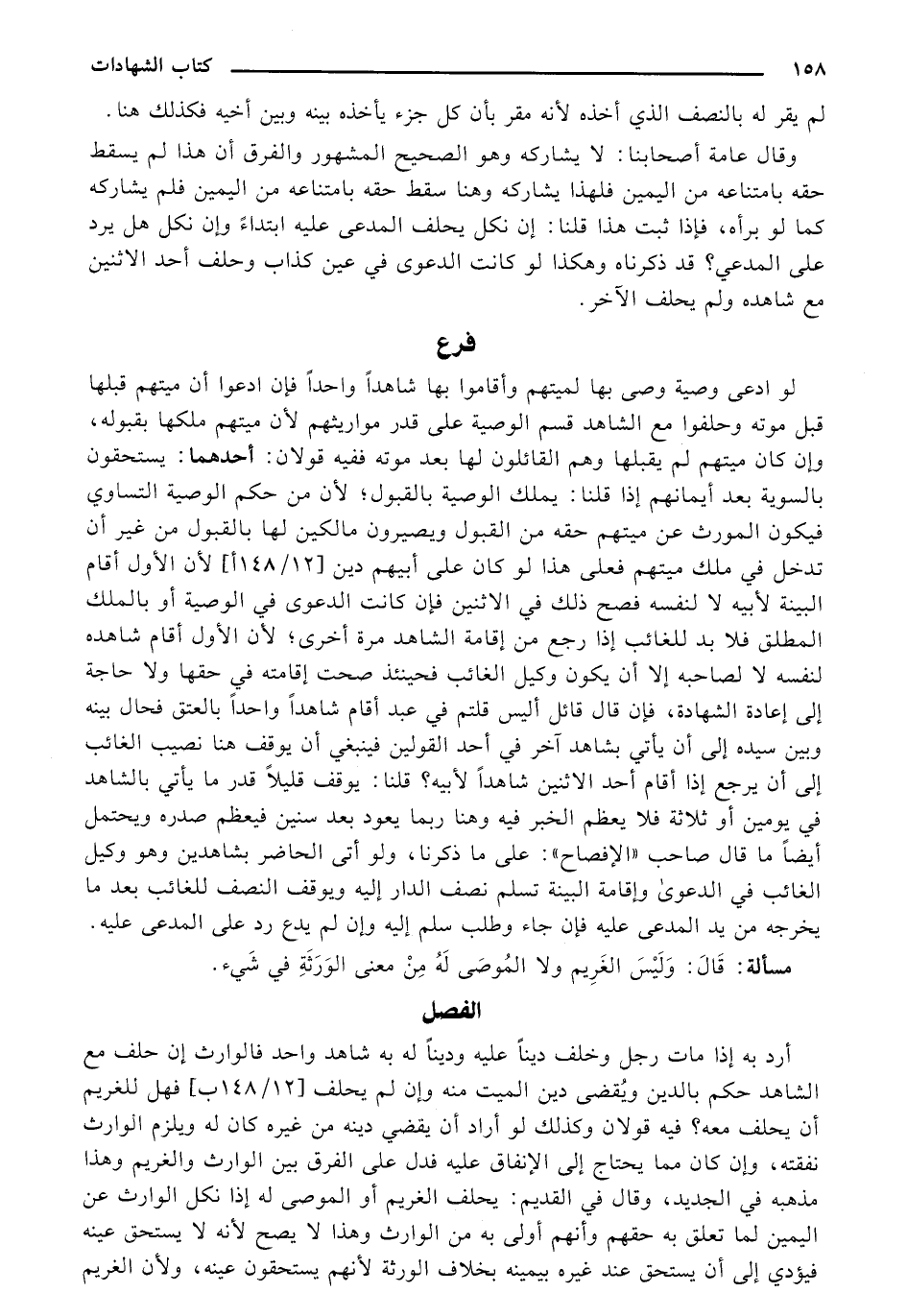 أرد به إذا مات رجل وخلف دينًا عليه ودينًا به شاهد واحد فالوارث إن حلف مع الشاهد حكم بالدين ويُقضي دين الميت منه وإن لم يحلف [12/ 148 ب] فهل للغريم أن يحلف معه؟ فيه قولان وكذلك لو أراد أن يقضي دينه من غيره كان له ويلزم الوارث نفقته، وإن كان مما يحتاج إلى الإنفاق عليه فدل على الفرق بين الوارث والغريم وهذا مذهبه في الجديد، وقال في القديم: يحلف الغريم أو الموصى له إذا نكل الوارث عن اليمين لما تعلق به حقهم وأنهم أولى به من الوارث وهذا لا يصح لأنه لا يستحق عينه فيؤدي إلى أن يستحق عند غيره بيمينه بخلاف الورثة لأنهم يستحقون عينه، ولأن الغريم