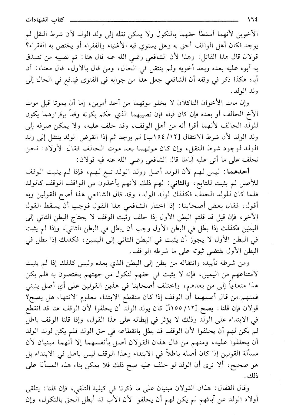 ومن شرطه تأييده وانتقاله من بطن إلى البطن الذي بعده وليس كذلك إذا لم يثبت لامتناعهم من اليمين، فإنه لا يثبت في حقهم لنكول من جهتهم يختصون به فلم يكن هذا متعديًا إلى من بعدهم، واختلف أصحابنا في هذين القولين على أي أصل ينبني فمنهم من قال أصلهما أن الوقف إذا كان منقطع الابتداء معلوم الانتهاء هل يصح؟ قولان فإن قلنا: يصح [12/ 155 أ] كان يولد الولد أن يحلفوا لأن الوقف هنا قد انقطع في الابتداء على الولد وذلك لا يؤثر في إبطاله على هذا القول، وإذا قلنا الوقف باطل لم يكن لهم أن يحلفوا لأن الوقف قد بطل بانقطاعه في حق الولد فلم يكن لولد الولد أن يحلفوا عليه، ومنهم من قال هذان القولان أصل بأنفسهما إلا أنهما مبنيان لأن مسألة القولين إذا كان أصله باطلًا في الابتداء وهذا الوقف ليس باطل في الابتداء بل هو صحيح، ألا ترى أن الولد لو حلف عليه صح ذلك فلا يمكن بناء هذه المسألة على ذلك.