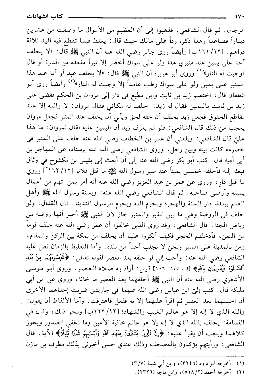 الرجال. ثم قال الشافعي: فذهبوا إلى أن العظيم من الأموال ما وصفت من عشرين دينارًا فصاعدًا وهذا ذكره ردًا على مالك حيث قال: يغلظ فيما تقطع في اليد ثلاثة دراهم. [12/ 161 ب] وأيضًا روى جابر رضي الله عنه أن النبي صلى الله عليه وسلم قال: "لا يحلف أحد على يمين عند منبري هذا ولو على سواك أخضر إلا تبوأ مقعده من النار" أو قال "وجبت له النار" وروي أبو هريرة أن النبي صلى الله عليه وسلم قال: "لا يحلف عبد أو أمة عند هذا المنبر على يمين ولو على سواك رطب عامدًا إلا وجبت له النار" وأيضًا روي أبو غطفان قال: اختصم زيد بن ثابت وابن مطيع في دار إلى مروان بن الحكم فقضى على زيد بن ثابت باليمين فقال له زيد: احلف له مكاني فقال مروان: لا والله إلا عند مقاطع الحقوق فجعل زيد يحلف أن حقه لحق ويأبي أن يحلف عند المنبر فجعل مروان يعجب من ذلك قال الشافعي: فلو لم يعرف زيد أن اليمين عليه لقال لمروان: ما هذا علي قال الشافعي: وبلغني أن عمر بن الخطاب رضي الله عنه حلف على المنبر في خصومه كانت بينه وبين رجل، وروى الشافعي رضي الله عنه بإسناده عن المهاجر بن أبي أمية قال: كتب أبو بكر رضي الله عنه إلى أن أبعث إلى بقيس بن مكشوح في وثاق فبعثه إليه فأحلفه خمسين يمينًا عند منبر رسول الله صلى الله عليه وسلم ما قتل فلانًا [12/ 162 أ] وروي ما قبل دارٍ، وروي عن عمر بن عبد العزيز رضي الله عنه أنه أمر بمن اتهم من أعمال يمينه وأرضى صاحبه. ثم قال الشافعي رضي الله عنه: وبسنة رسول الله صلى الله عليه وسلم وأهل العلم ببلدنا دار السنة والهجرة وبحرم الله وبحرم الرسول اقتدينا. قال القفال: ولو حلف في الروضة وهي ما بين القبر والمنبر جاز لأن النبي صلى الله عليه وسلم أخبر أنها روضة من رياض الجنة. قال الشافعي: وقد روي الذين خالفوا أن عمر رضي الله عنه حلف قومًا من اليمين، فأدخلهم الحجر فكيف أنكروا علينا أن يحلف من بمكة بين الركن والمقام، ومن بالمدينة على المنبر ونحن لا نجلب أحدًا من بلده. وأما التغليظ بالزمان نص عليه الشافعي رضي الله عنه: وأحب إلى لو حلفه بعد العصر لقوله تعالى: {تَحْبِسُونَهُمَا مِن بَعْدِ الصَّلاَةِ فَيُقْسِمَانِ بِاللَّهِ} [المائدة:106] قيل: أراد به صلاة العصر، وروي أبو موسى الأشعري رضي الله عنه أن النبي صلى الله عليه وسلم أحلفهما بعد العصر ما خانا، وروي عن ابن أبي مليكة قال: كتب إلى ابن عباس رضي الله عنهما في جاريتين ضربت إحداهما الأخرى أن احبسهما بعد العصر ثم أقرأ عليهما إلا به ففعل فاعترفت. وأما الألفاظ أن يقول: والله الذي لا إله إلا هو عالم الغيب والشهادة [12/ 162 ب] ونحو ذلك، وقال في القسامة: يحلف بالله الذي لا إله إلا هو عالم خافية الأعين وما تخفي الصدور ويجوز كلاهما ويجب أن يقرأ عليه: {إِنَّ الَّذِينَ يَشْتَرُونَ بِعَهْدِ اللَّهِ وَأَيْمَانِهِمْ ثَمَناً قَلِيلاً} الآية. قال الشافعي: ورأيتهم يؤكدون بالمصحف وذلك عندي حسن أخبرني بذلك مطرف بن مازن