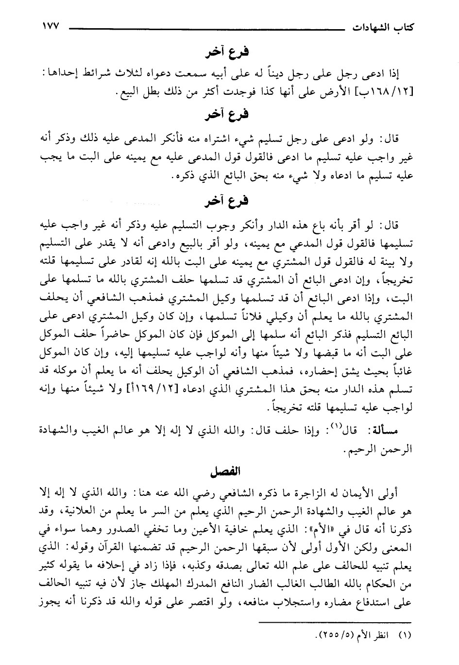 قال: لو أقر بأنه باع هذه الدار وأنكر وجوب التسليم عليه وذكر أنه غير واجب عليه تسليمها فالقول قول المدعي مع يمنيه، ولو أقر بالبيع وادعى أنه لا يقدر على التسليم ولا بينة له فالقول قول المشتري مع يمينه على البت بالله إنه لقادر على تسليمها قلته تخريجًا، وإن ادعى البائع أن المشتري قد تسلمها حلف المشتري بالله ما تسلمها على البت، وإذا ادعى البائع أن قد تسلمها وكيل المشتري فمذهب الشافعي أن يحلف المشتري بالله ما يعلم أن وكيلي فلانًا تسلمها، وإن كان وكيل المشتري ادعى على البائع التسليم فذكر البائع أنه سلمها إلى الموكل فإن كان الموكل حاضرًا حلف الموكل على البت أنه ما قبضها ولا شيئًا منها وأنه لواجب عليه تسليمها إليه، وإن كان الموكل غائبًا بحيث يشق إحضاره، فمذهب الشافعي أن الوكيل يحلف أنه ما يعلم أن موكله قد تسلم هذه الدار منه بحق هذا المشتري الذي ادعاه [12/ 169 أ] ولا شيئًا منها وإنه لواجب عليه تسليمها قلته تخريجًا.
