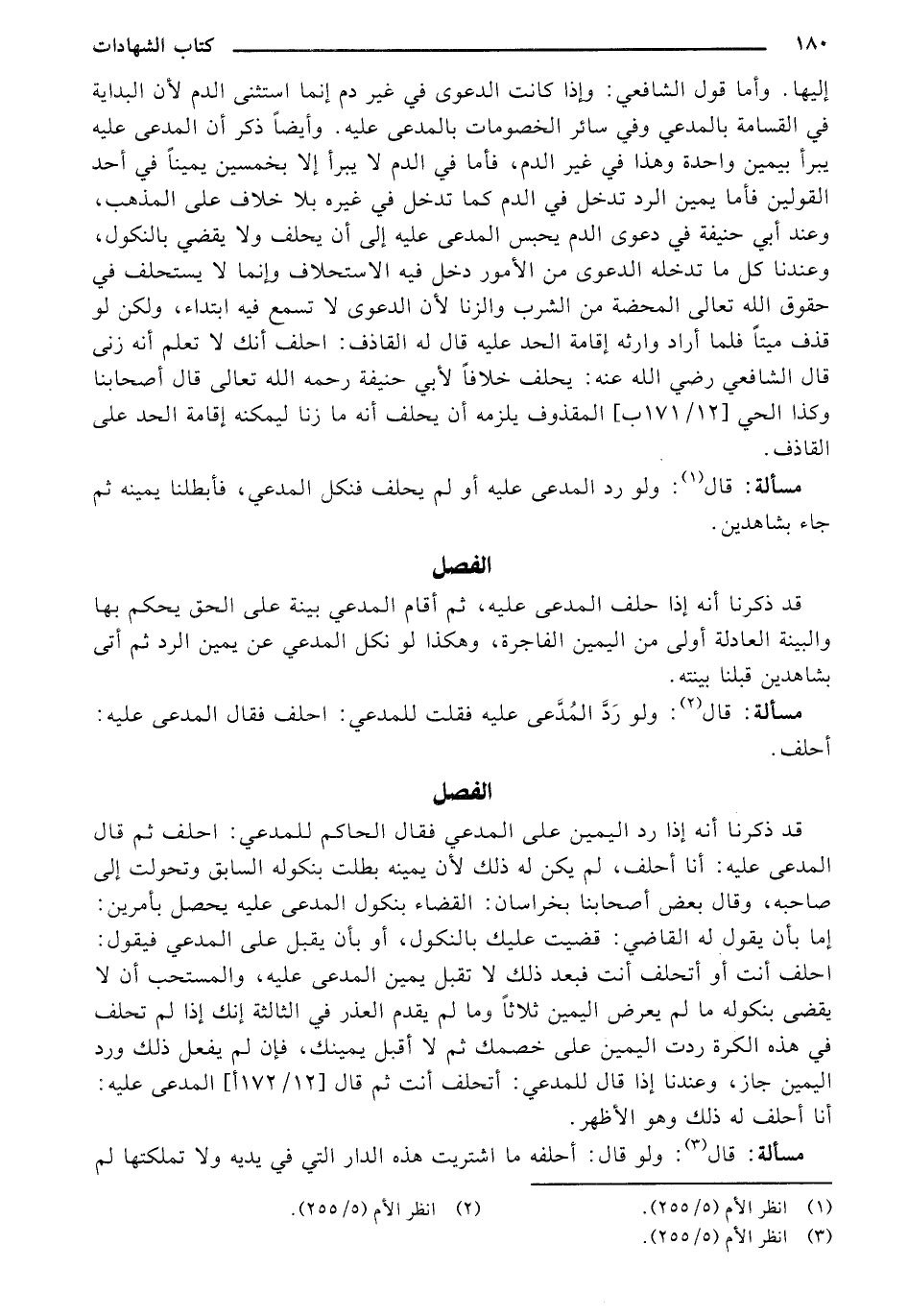 إليها. وأما قول الشافعي: وإذا كانت الدعوى في غير دم إنما استثنى الدم لأن البداية في القسامة بالمدعي وفي سائر الخصومات بالمدعي عليه. وأيضًا ذكر أن المدعي عليه يبرأ بيمين واحدة وهذا في غير الدم، فأما في الدم لا يبرأ إلا بخمسين يمينًا في أحد القولين فأما يمين الرد تدخل في الدم كما تدخل في غيره بلا خلاف على المذهب، وعند أبي حنيفة في دعوى الدم يحبس المدعي عليه إلى أن يحلف ولا يقضي بالنكول، وعندنا كل ما تدخله الدعوى من الأمور دخل فيه الاستحلاف وإنما لا يستحلف في حقوق الله تعالى المحضة من الشرب والزنا لأن الدعوى لا تسمع فيه ابتداء، ولكن لو قذف ميتًا فلما أراد وارثه إقامة الحد عليه قال له القاذف: احلف أنك لا تعلم أنه زنى قال الشافعي رضي الله عنه: يحلف خلافًا لأبي حنيفة رحمه الله تعالى قال أصحابنا وكذا الحي [12/ 171 ب] المقذوف يلزمه أن يحلف أنه ما زنا ليمكنه إقامة الحد على القاذف.