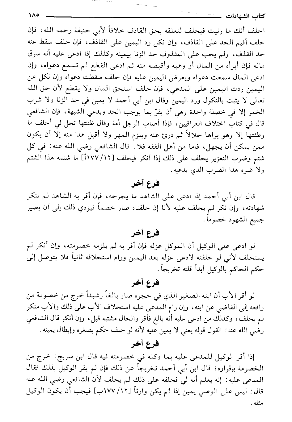 أحلف أنك ما زنيت فيحلف لتعلقه بحق القاذف خلافًا لأبي حنيفة رحمه الله، فإن حلف أقيم الحد على القاذف، وإن نكل رد اليمين على القاذف، فإن حلف سقط عنه حد القذف، ولم يجب على المقذوف حد الزنا بيمينه وكذلك إذا ادعى عليه أنه سرق ماله فإن أبرأه من المال أو وهبه وأقبضه منه ثم ادعى القطع لم تسمع دعواه، وإن أدعى المال سمعت دعواه ويعرض اليمين عليه فإن حلف سقطت دعواه وإن نكل عن اليمين ردت اليمين على المدعي، فإن حلف استحق المال ولا يقطع لأن حق الله تعالى لا يثبت بالنكول ورد اليمين وقال ابن أبي أحمد لا يمين في حد الزنا ولا شرب الخمر إلا في خصلة واحدة وهي أن يقر بما يوجب الحد ويدعي الشبهة، فإن الشافعي قال في كتاب اختلاف العراقيين، فإذا أصاب الرجل أمة وقال ظننتها تحل لي أحلف ما وطئتها إلا وهو يراها حلالاً ثم درئ عنه ويلزم المهر ولا أقبل هذا منه إلا أن يكون ممن يمكن أن يجهل، فإما من أهل الفقه فلا. قال الشافعي رضي الله عنه: في كل شتم وضرب التعزير يحلف على ذلك إذا أنكر فيحلف [12/ 177 أ] ما شتمه هذا الشتم ولا ضره هذا الضرب الذي يدعيه.