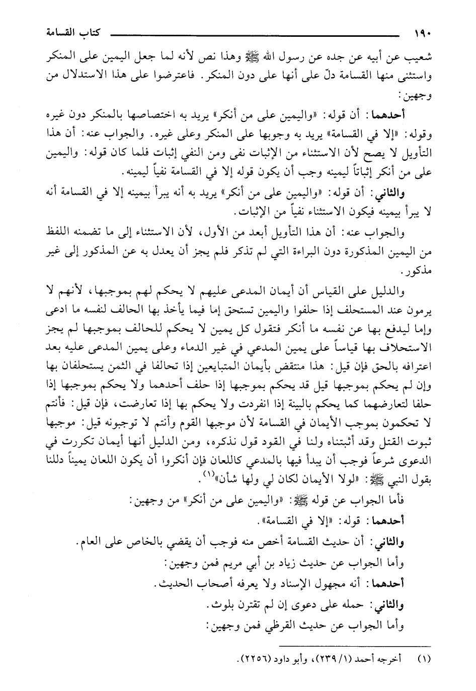 شعيب عن أبيه عن جده عن رسول الله صل الله عليه وسلم وهذا نص لأنه لما جعل اليمين على المنكر واستثنى منها القسامة دل على أنها على دون المنكر. فاعترضوا على هذا الاستدلال من وجهين: