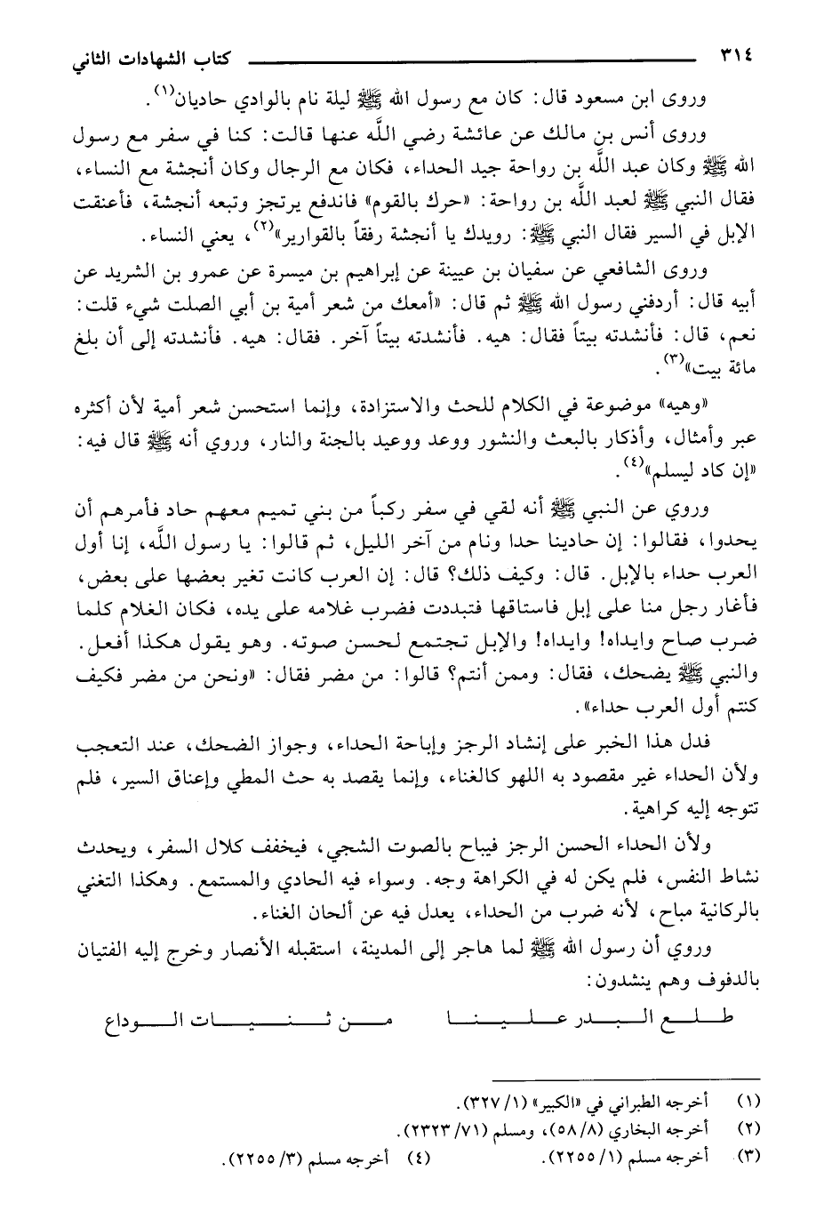 وروى أنس بن مالك، عن عائشة رضي الله عنها قالت: كنا في سفر رسول الله {صلى الله عليه وسلم}، وكان عبد الله بن رواحة جيد الحداء، فكان مع الرجال، وكان أنجشة مع النساء، فقال النبي {صلى الله عليه وسلم} لعبد الله بن رواحة: " حرك بالقوم "، فاندفع يرتجز، وتبعه أنجشة، فأعنقت الإبل في السير، فقال النبي {صلى الله عليه وسلم} "رويدك يا أنجشة رفقًا بالقوارير" يعني النساء. وروى الشافعي عن سفيان بن عيينة عن إبراهيم بن ميسرة عن عمرو بن الشريد عن أبيه قال: أردفني رسول الله {صلى الله عليه وسلم} ثم قال: "أمعك من شعر أمية بن أبي الصلت شيء؟ قلت: نعم. قال: فأنشدته بيتا فقال: هيه. فأنشدته بيتا آخر. فقال: هيه. فأنشدته إلى أن بلغ مائة بيت".