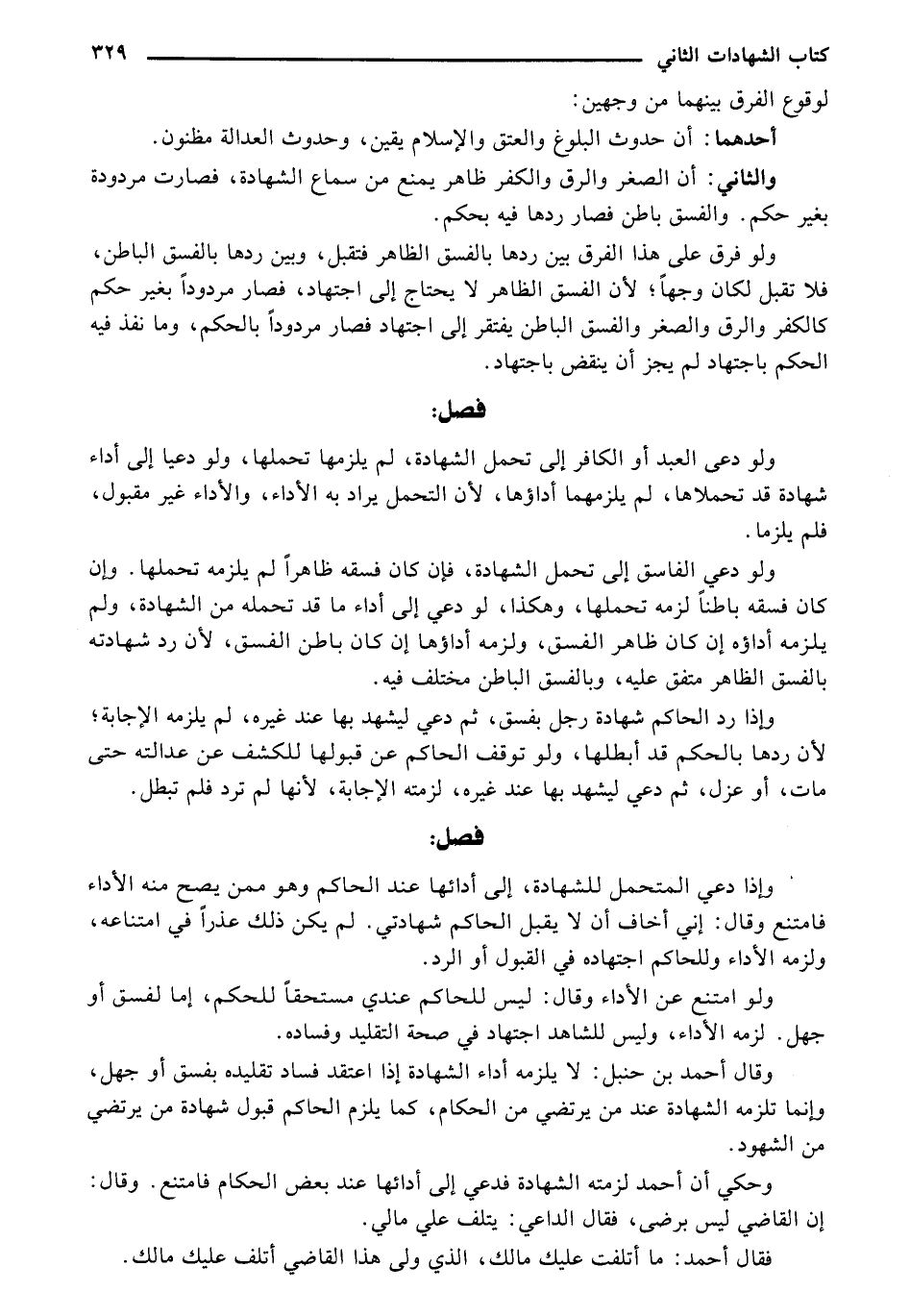 وقال أحمد بن حنبل: لا يلزمه أداء الشهادة إذا اعتقد فساد تقليده بفسق أو جهل، وإنما تلزمه الشهادة عند من يرتضي من الحكام كما يلزم الحاكم قبول شهادة من يرتضي من الشهود.