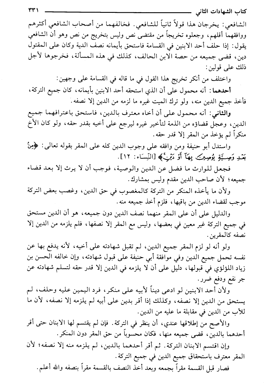 الشافعي: يخرجان هذا قولاً ثانياً للشافعي. فخالفهما من أصحاب الشافعي أكثرهم ووافقهما أقلهم، وجعلوه تخريجاً من مقتضى نص وليس بتخريج من نص وهو أن الشافعي يقول: إذا حلف أحد الابنين في القسامة فاستحق بأيمانه نصف الدية وكان على المقتول دين، قضى جميعه من حصة الابن الحالف، كذلك في هذه المسألة، فخرجوها لأجل ذلك على قولين: