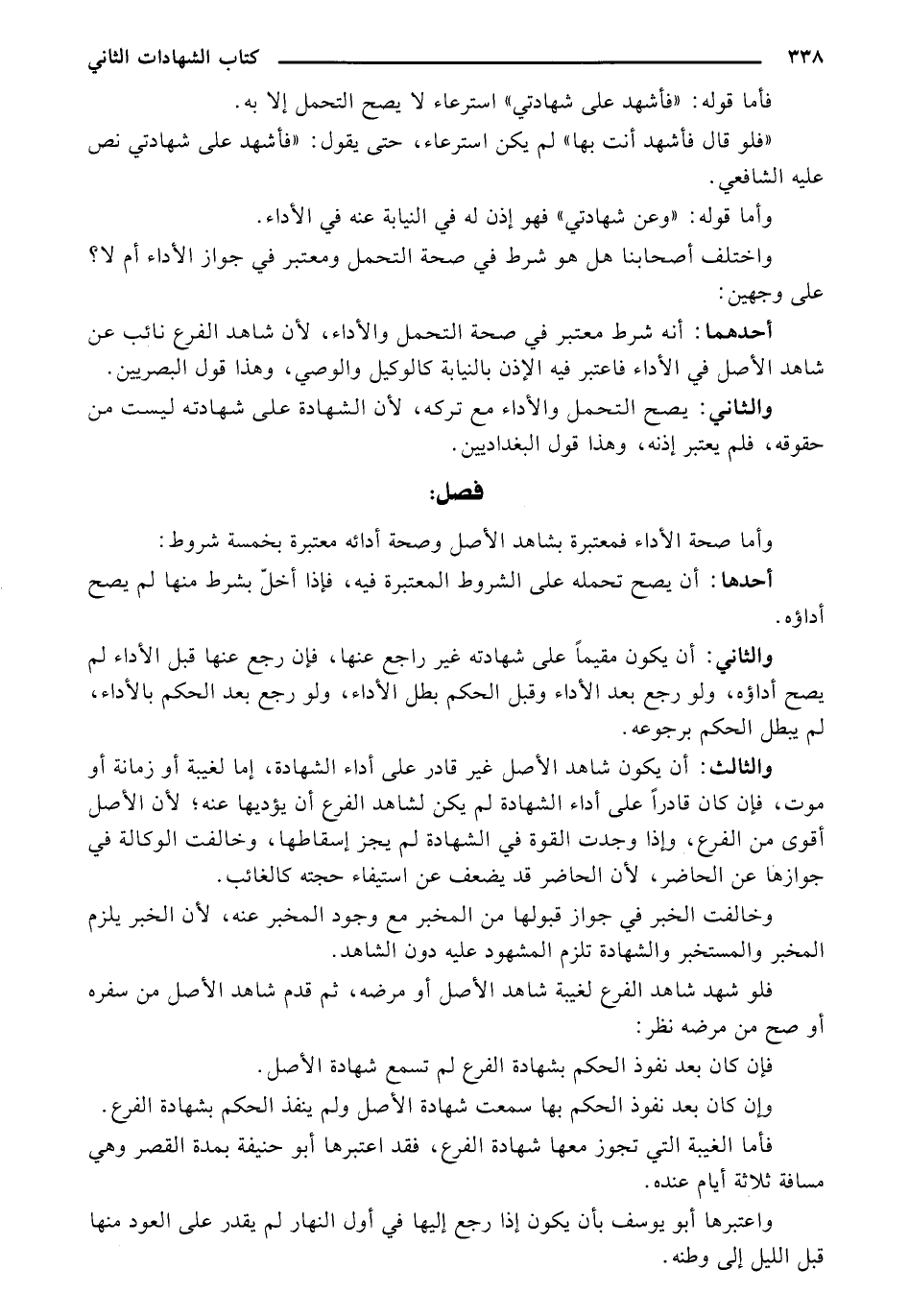 والثالث: أن يكون شاهد الأصل غير قادر على أداء الشهادة إما لغيبة أزمانه أو موت، فإن كان قادرا على أداء الشهادة لم يكن لشاهد الفرع أن يؤديها عنه، لأن الأصل أقوى من الفرع وإذا وجدت القوة في الشهادة لم يجز إسقاطها وخالفت الوكالة في جوازها عن الحاضر لأن الحاضر قد يضعف عن استيفاء حجته كالغائب