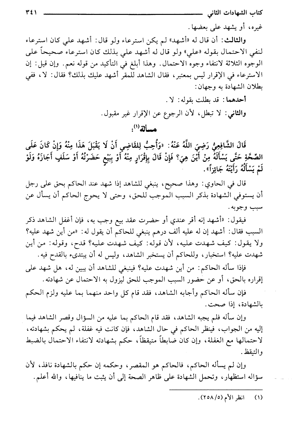 قال في الحاوي: وهذا صحيح، ينبغي للشاهد إذا شهد عند الحاكم بحق على رجل أن يستوفي والشهادة بذكر السبب الموجب للحق، وحتى لا يحوج الحاكم أن يسأل عن سبب وجوبه