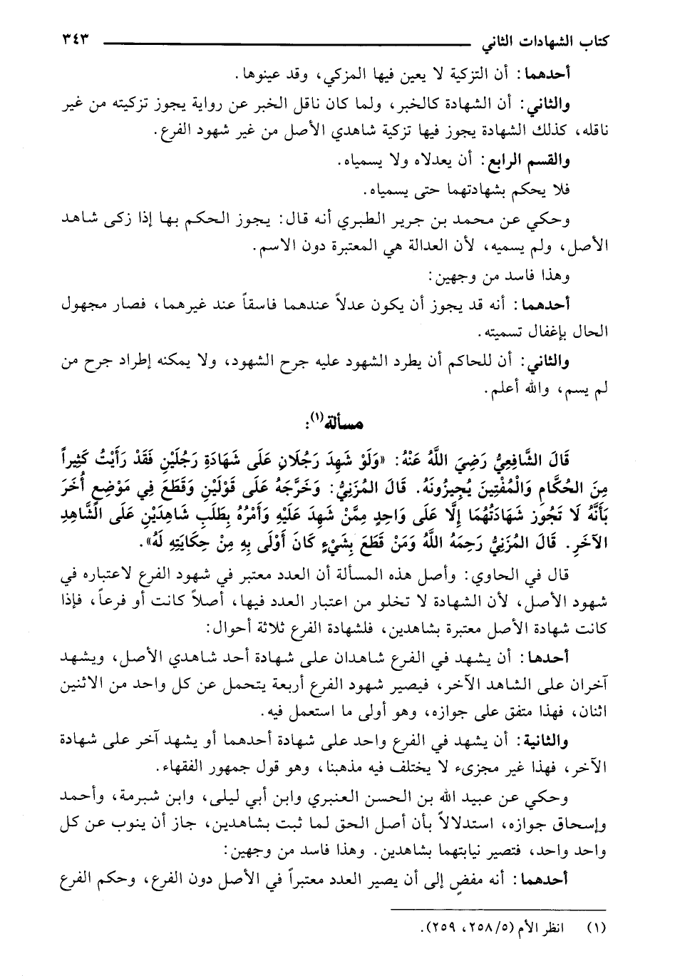 قال في الحاوي: وأصل هذه المسألة أن العدد معتبر في شهود الفرع لاعتباره في شهود الأصل، لأن الشهادة لا تخلو من اعتبار العدد فيها، أصلاً كانت أو فرعاً فإذا كانت شهادة الأصل معتبرة بشاهدين فلشهادة الفرع ثلاثة أحوال: