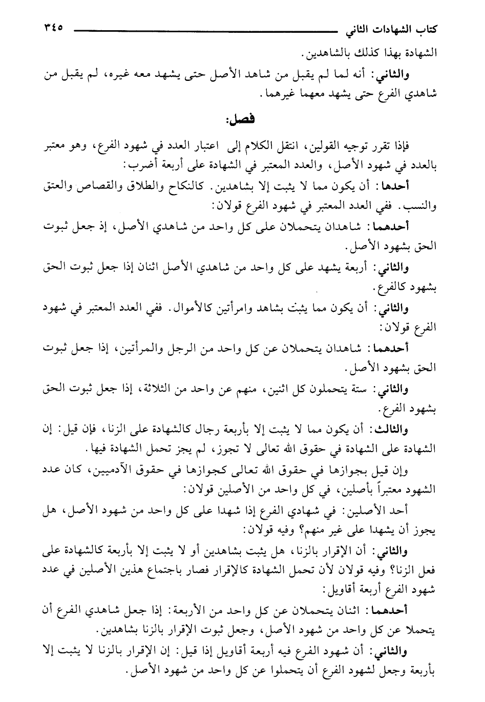 أحدها: أن يكون مما لا يثبت إلا بشاهدين. كالنكاح والطلاق والقصاص والعتق والنسب. ففي العدد المعتبر في شهود الفرع قولان: