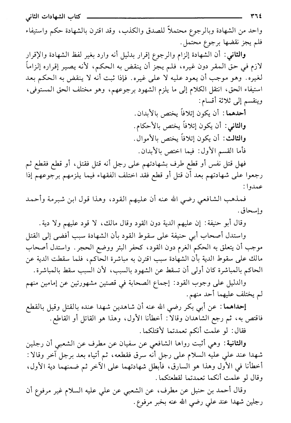 والثاني: أن الشهادة إلزام والرجوع إقرار بدليل أنه وارد بغير لفظ الشهادة والإقرار لازم في حق المقر دون غيره، فلم يجز أن ينقض به الحكم، لأنه يصير إقراره إلزاما لغيره. وهو موجب أن يعود عليه لا علي غيره. فإذا ثبت أنه لا ينقض به الحكم بعد استيفاء الحق، انتقل الكلام إلي ما يلزم الشهود برجوعهم، وهو مختلف الحق المستوفي، وينقسم إلي ثلاثة أقسام: