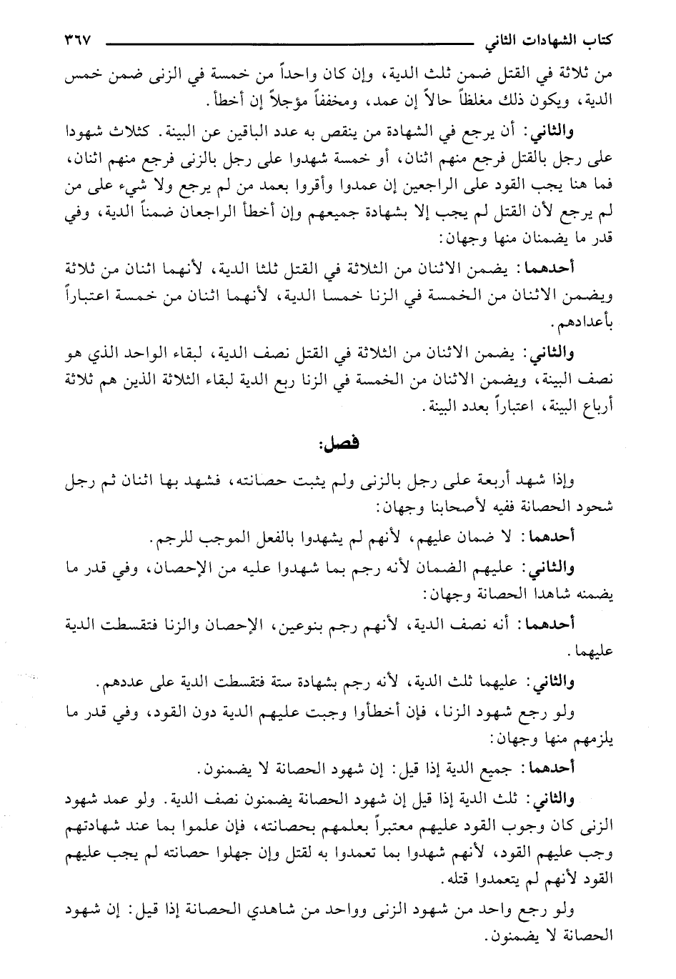 والثاني: ثلث الدية إذا قيل إن شهود الحصانة يضمنون نصف الدية. ولو عمد شهود الزني كان وجوب القود عليهم معتبرا بعلمهم بحصانته، فإن علموا بما عند شهادتهم وجب عليهم القود، لأنهم شهدوا بما تعمدوا به لقتل وإن جهلوا حصانته لم يجب عليهم القود لأنهم لم يتعمدوا قتله.
