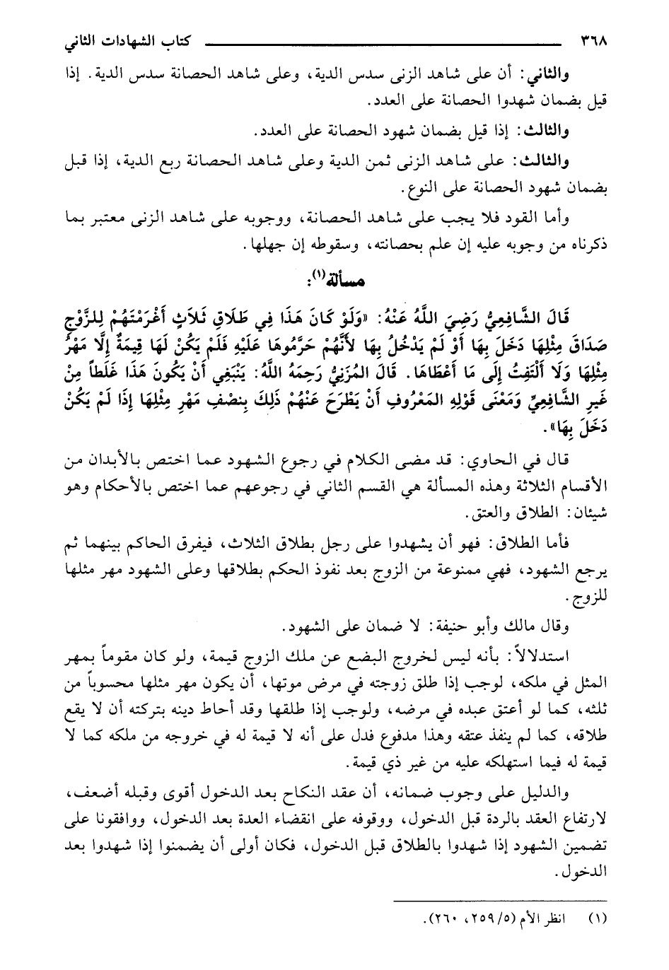 والثاني: أن (على) شاهد الزني سدس الدية، وعلي شاهد الحصانة سدس الدية. إذا قيل بضمان شهدوا الحصانة علي العدد.