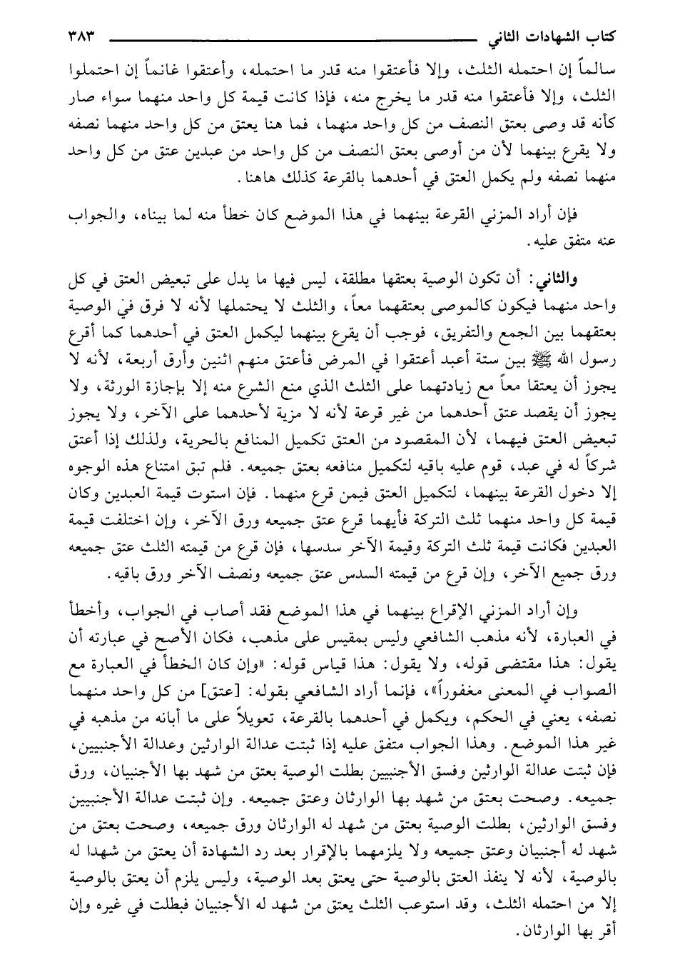 وإن أراد المزني الإقراع بينهما في هذا الموضع فقد أصاب في الجواب، وأخطأ في العبارة، لأنه مذهب الشافعي وليس بمقيس على مذهب، فكان الأصح في عبارته أن يقول: هذا مقتضى قوله، ولا يقول: هذا قياس قوله: "وإن كان الخطأ في العبارة مع الصواب في المعنى مغفورًا"، فإنما أراد الشافعي بقوله: [عتق] من كل واحد منهما نصفه، يعني في الحكم، ويكمل في أحدهما بالقرعة، تعويلًا على ما أبانه من مذهب في غير هذا الموضع. وهذا الجواب متفق عليه إذا ثبتت عدالة الوارثين وعدالة الأجنبيين، فإن ثبتت عدالة الوارثين وفسق الأجنبيين بطلت الوصية بعتق من شهد بها الأجنبيان، ورق جميعه. وصحت بعتق من شهد بها الوارثان وعتق جميعه. وإن ثبتت عدالة الأجنبيين وفسق الوارثين، بطلت الوصية بعتق من شهد له الوارثان ورق جميعه، وصحت بعتق من شهد له أجنبيان وعتق جميعه ولا يلزمها بالإقرار بعد رد الشهادة أن يعتق من شهدا له بالوصية، لأنه لا ينفذ العتق بالوصية حتى يعتق بعد الوصية، وليس يلزم أن يعتق بالوصية إلا من احتمله الثلث، وقد استوعب الثلث يعتق من شهد له الأجنبيان فبطلت في غيره وإن أقر بها الوارثان.