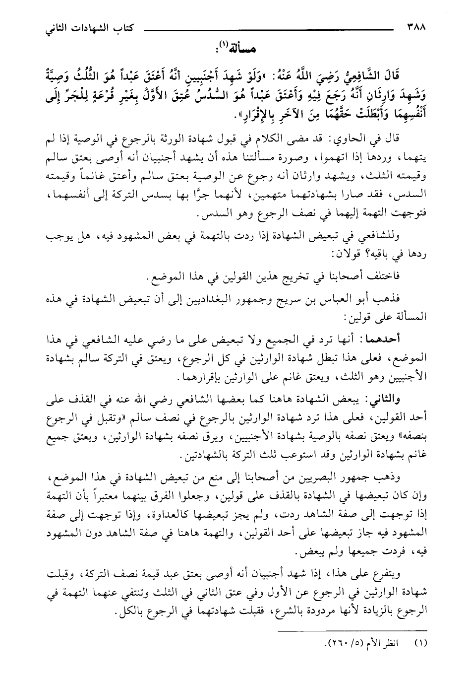 قال الشافعي رضي الله عنه: "ولو شهد أجنبيين أنه أعتق عبدًا هو الثلث وصيًة وشهد وارثان أنه رجع فيه وأعتق عبدًا هو السدس عتق الأول بغير قرعٍة للجر إلي أنفسهما وأبطلت حقهما من الآخر بالإقرار".