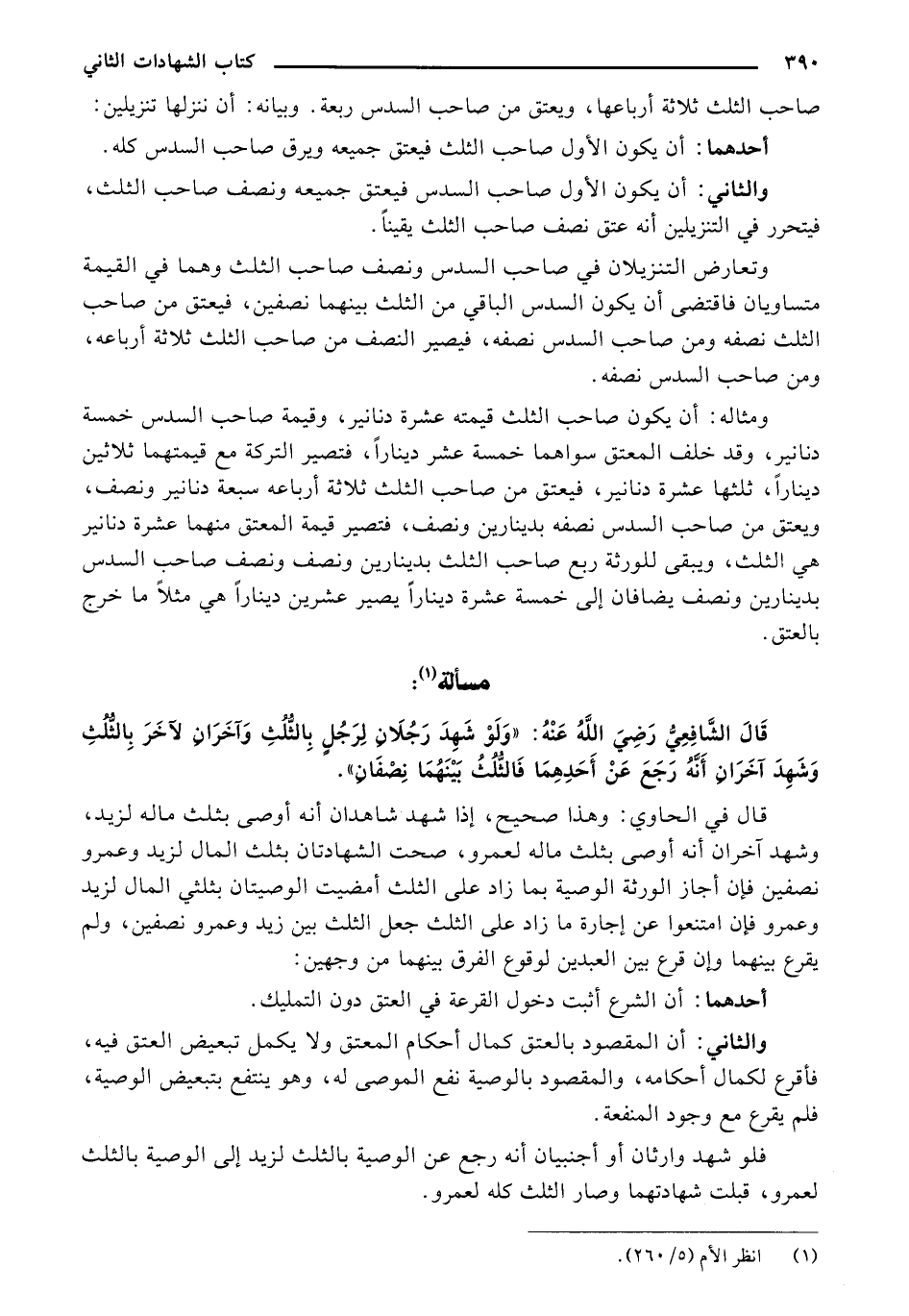 قال الشافعي رضي الله عنه: "ولو شهد رجلان لرجٍل بالثلث وآخران لآخر بالثلث وشهد آخران أنه رجع عن أحدهما فالثلث بينهما نصفان".