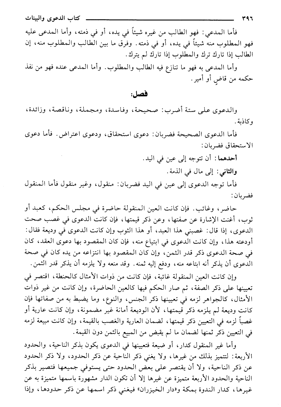وأما غير المنقول كدار، أو ضيعة فتعيينها في الدعوى يكون بذكر الناحية، والحدود الأربعة: لتمييز بذلك من غيرها، ولا يغني ذكر الناحية عن ذكر الحدود، ولا ذكر الحدود عن ذكر الناحية، ولا أن يقتصر على بعض الحدود حتى يستوفي جميعها فتصير بذكر الناحية والحدود الأربعة متميزة عن غيرها إلا أن تكون الدار مشهورة باسمها متميزة به عن غيرها، كدار الندوة بمكة و"دار الخيزران"فيغني ذكر اسمها عن ذكر حدودها، وإذا