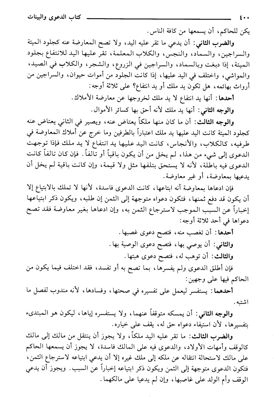 والوجه الثالث: أن ما كان منها ملكًا يعتاض عنه، ويصير في الثاني يعتاض عنه كجلود الميتة كانت اليد عليها يد ملك اعتبارًا بالطرفين وما خرج عن أملاك المعاوضة في طرفيه كالكلاب، والأنجاس، كانت اليد عليها يد انتفاع لا يد ملك فإذا توجهت الدعوى إلي شيء من هذا، لم يخل من أن يكون باقيًا أو تالفًا. فإن كان تالفًا كانت الدعوى فيه باطلة، لأنه لا يستحق بتلفها مثل ولا قيمة، وإن كانت باقية لم يخل أن يدعيها بمعاوضة، أو غير معاوضة.