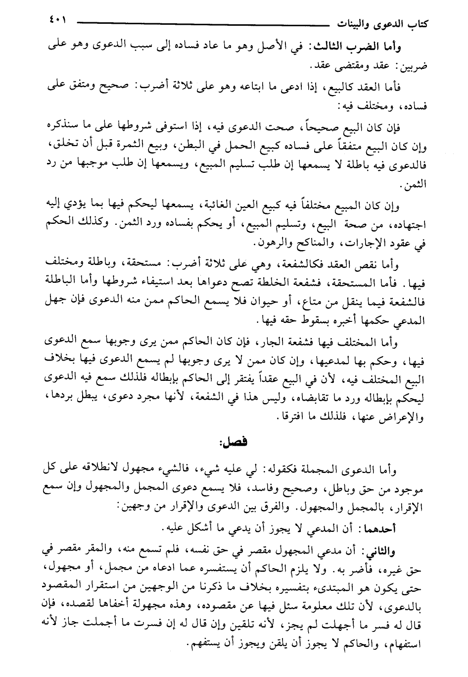 وأنا نقص العهد فكالشفعة، وهي على ثلاثة أضرب: مستحقة، وباطلة ومختلفة فيها. فأما المستحقة، فشفعة الخلطة تصح دعواها بعد استيفاء شروطها وأما الباطلة فالشفعة فيما ينقل من متاع، أو حيوان فلا يسمع الحاكم ممن منه الدعوى فإن جهل المدعي حكمها أخبره بسقوط حقه فيها.