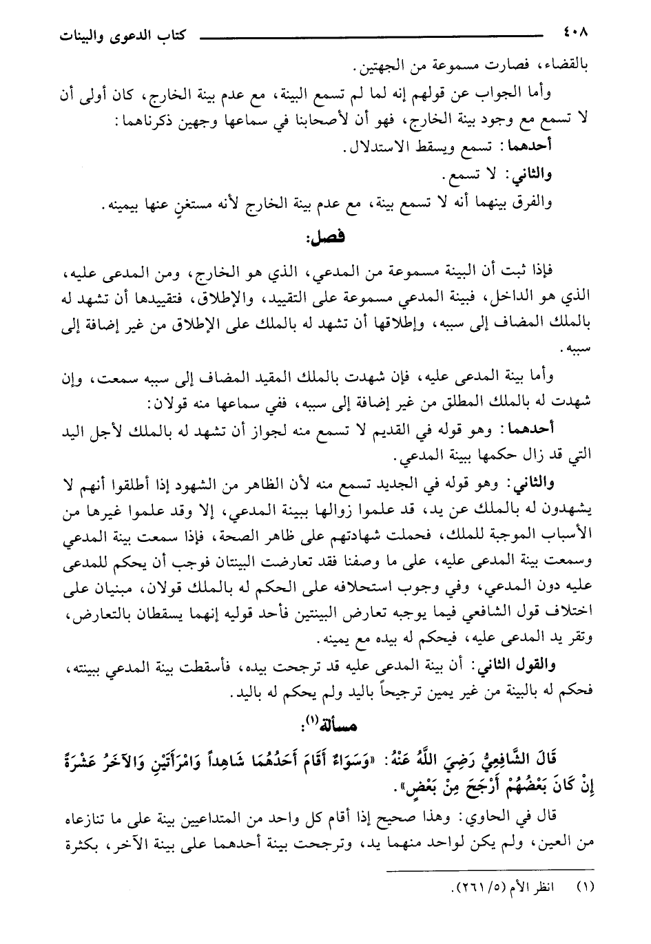 فإذا ثبت أن البينة مسموعة من المدعي، الذي هو الخارج، ومن المدعى عليه، الذي هو الداخل، فبينة المدعي مسموعة على التقييد، والإطلاق، فتقييدها أن تشهد له بالملك المضاف إلي سببه، وإطلاقها أن تشهد له بالملك على الإطلاق من غير إضافة إلي سببه.