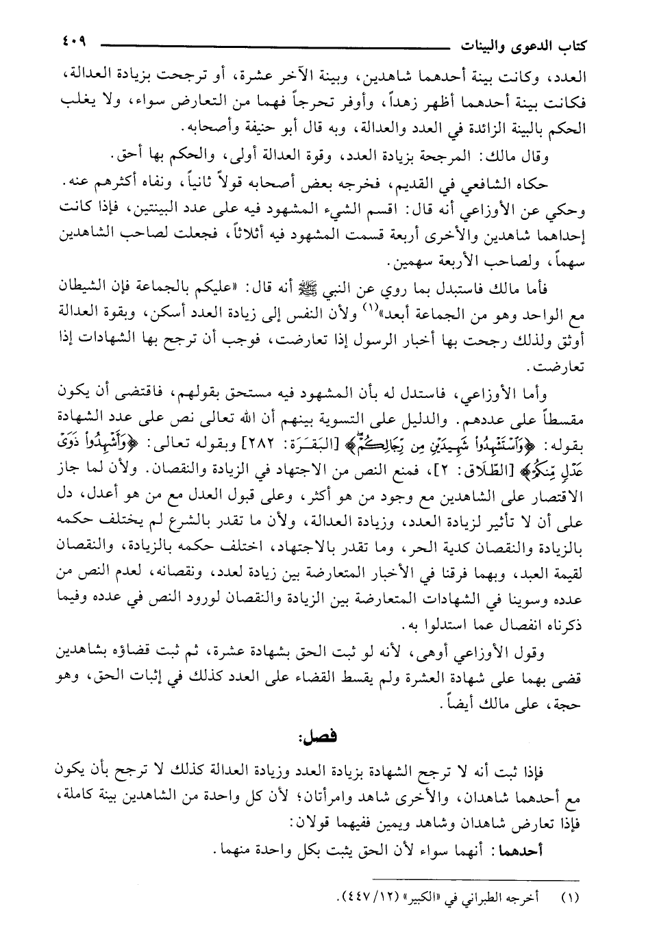 فأما مالك فاستبدل بما روي عن النبي صلى الله عليه وسلم أنه قال: "عليكم بالجماعة فإن الشيطان مع الواحد وهو من الجماعة أبعد" ولأن النفس إلي زيادة العدد أسكن، وبقوة العدالة أوثق ولذلك رجحت بها أخبار الرسول إذا تعارضت، فوجب أن ترجح بها الشهادات إذا تعارضت.