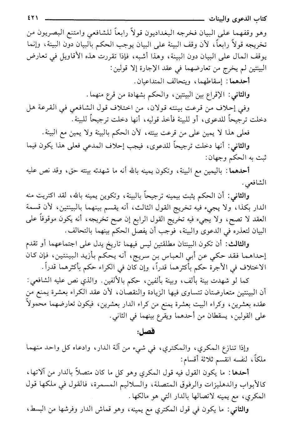 والثاني: أن الحكم يثبت بيمينه ترجيحًا بالبينةً، وتكون يمينه بالله، لقد اكتريت منه الدار بكذا. ولا يجيء فيه تخريج القول الثالث، أنه يقسم بينهما بالبينتين، لأن قسمة العقد لا تصح، ولا يجيء فيه تخريج القول الرابع إن صح تخريجه، أنه يكون موقوفا على البيان لتعذره في الدعوى والبينة، فوجب أن يفصل الحكم بينهما بالتحالف.