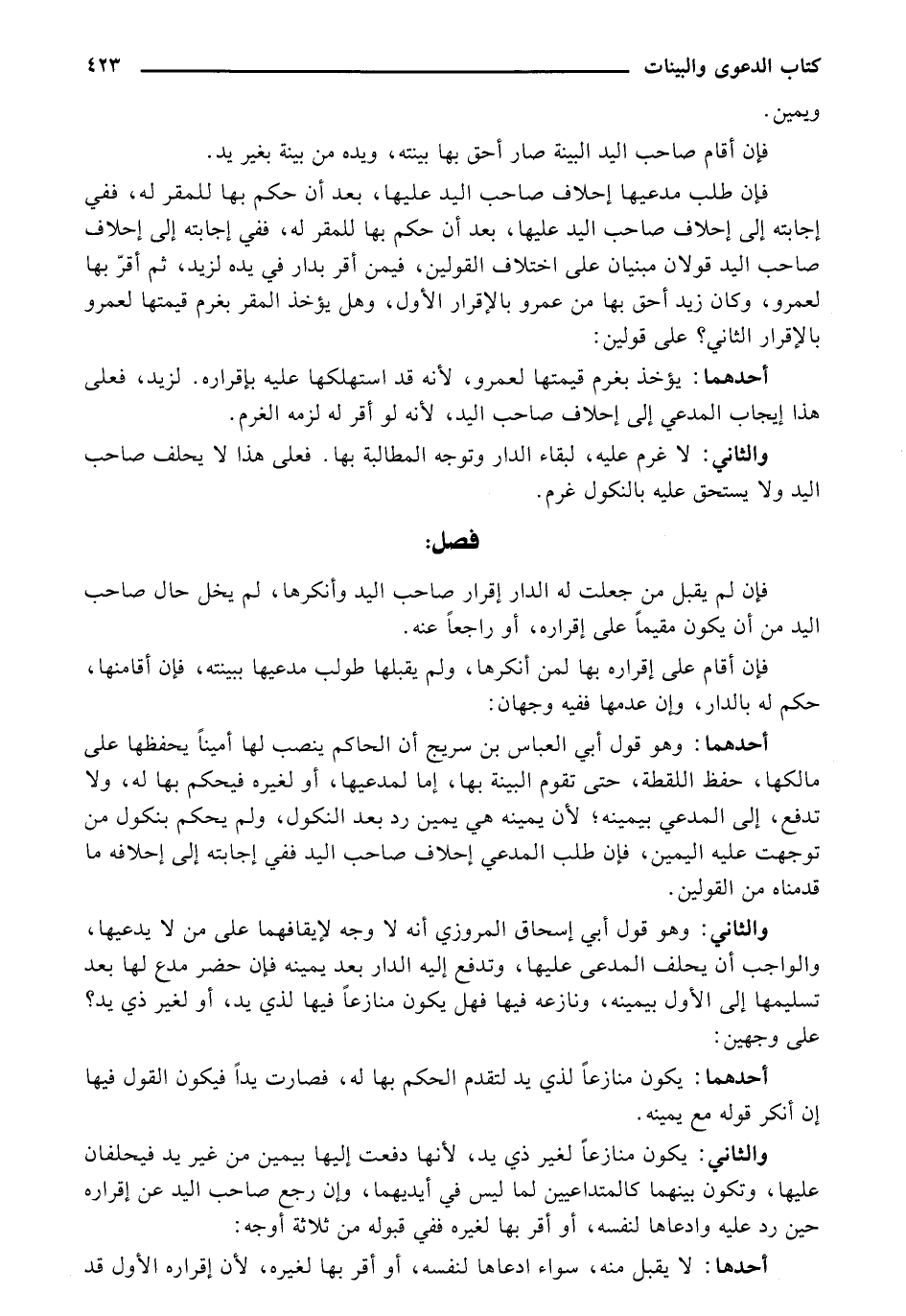 ف إن طلب مدعيها إحلاف صاحب اليد عليها، بعد أن حكم بها للمقر له، ففي إجابته إلى إحلاف صاحب اليد قولان مبنيان على اختلاف القولين فيمن أقر بدار في يده لزيد، ثم أقر بها لعمرو، وكان زيد أحق بها من عمرو بالإقرار الأول، وهل يؤخذ المقر بغرم قيمتها لعمرو بالإقرار الثاني؟ على قولين: