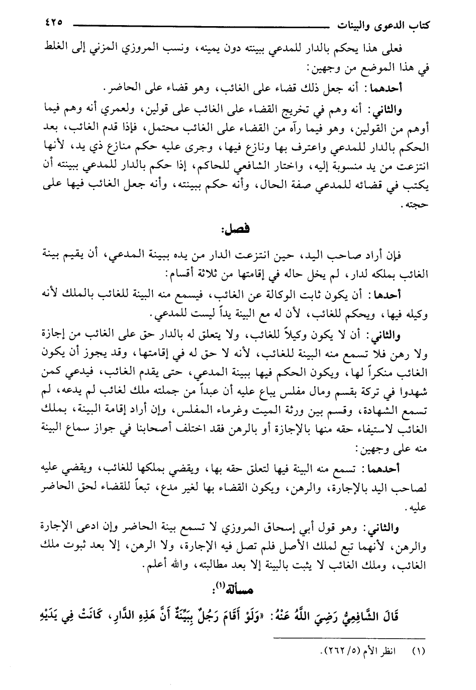 والثاني: صدر هذا الكتاب آليا بواسطة الموسوعة الشاملة وهو قول أبي إسحاق المروزي لا تسمع بينة الحاضر وإن ادعى الإجارة والرهن، لأنهما تبع لملك الأصل، فلم تصح فيه الإجارة، ولا الرهن، إلا بعد ثبوت ملك الغائب، وملك الغائب لا يثبت بالبينة إلا بعد مطالبته. والله أعلم.