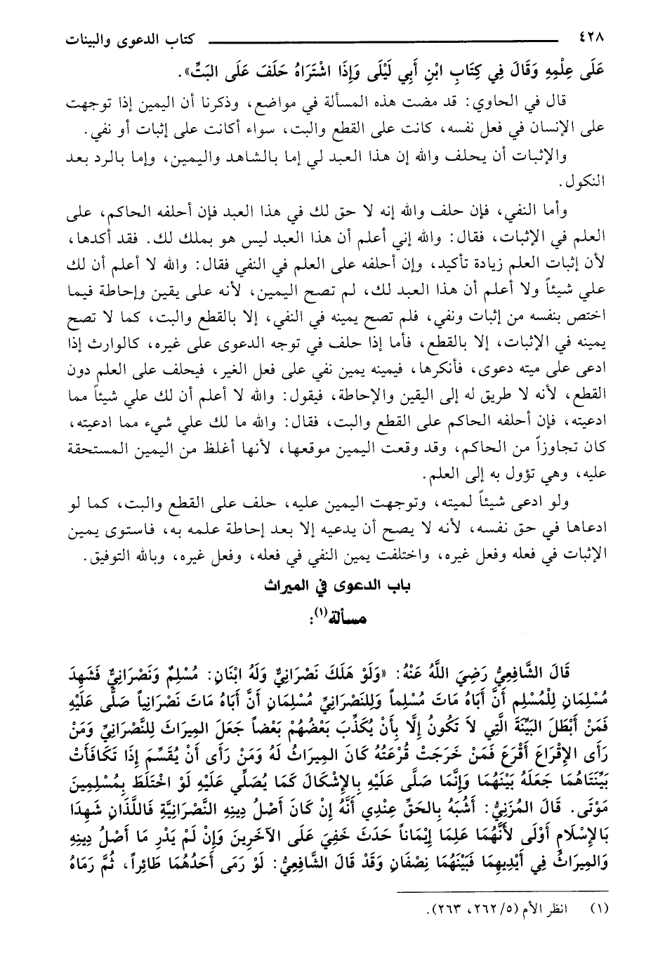 قال الشافعي رضي الله عنه: "ولو هلك نصراني وله ابنان: مسلم ونصراني فشهد مسلمان للمسلم أن أباه مات مسلمًا وللنصراني مسلمان أن أباه مات نصرانيًا صلى عليه فمن أبطل البينة التي لا تكون إلا بأن يكذب بعضهم بعضًا جعل الميراث للنصراني ومن رأى الإقراع أقرع فمن خرجت قرعته كان الميراث له ومن رأى أن يقسم إذا تكافأت بينتاهما جعله بينهما، وإنما صلى عليه بالإشكال كما يصلى عليه لو اختلط بمسلمين موتى قال المزني: أشبه بالحق عندي أنه إن كان أصل دينه النصرانية فاللذان شهدا بالإسلام أولى لأنهما علما إيمانا حدث خفي على الآخرين وإن لم يدر ما أصل دينه والميراث في أيديهما فبينهما نصفان وقد قال الشافعي: لو رمى أحدهما طائرا ثم رماه